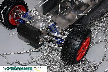 In order to improve performance of the HT2, the weight of the control arms on the front and rear axle has been reduced, while durability is simultaneously increased through the use of high quality duralumin. The weight of the suspension arms on the front axle is thereby reduced by 20g per arm (a total of 80g), while the weight of the rear axle suspension arms is reduced by 30g per arm.